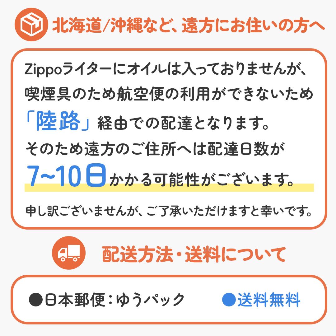 Zippoライターにオイルは入っておりませんが、喫煙具のため航空便の利用が出来ず「陸路」経由での配達となります。