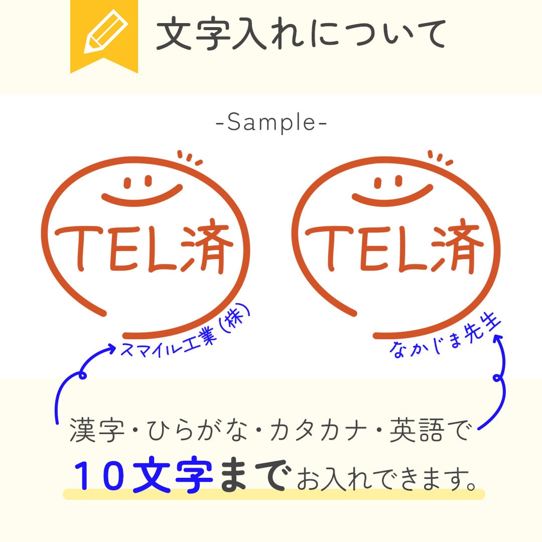 スマイルデザインスタンプの下部に、あなたのお名前や会社名など、好きな文字を10文字までお入れして作成します。