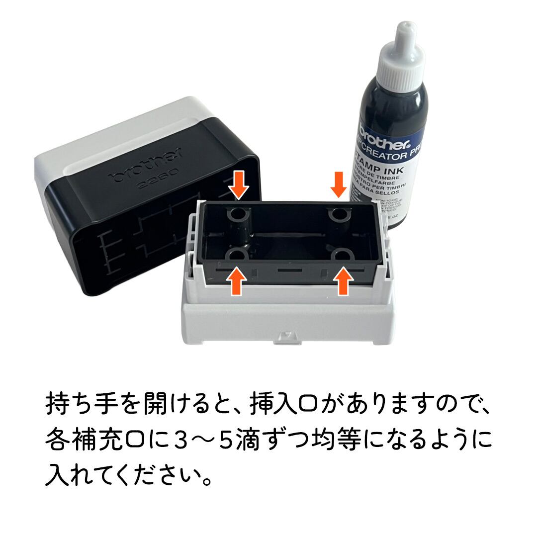 スタンプの持ち手部分を分解していただきますと、補充口がございますので各補充口に3〜5滴ずつ均等になるように入れてください。
