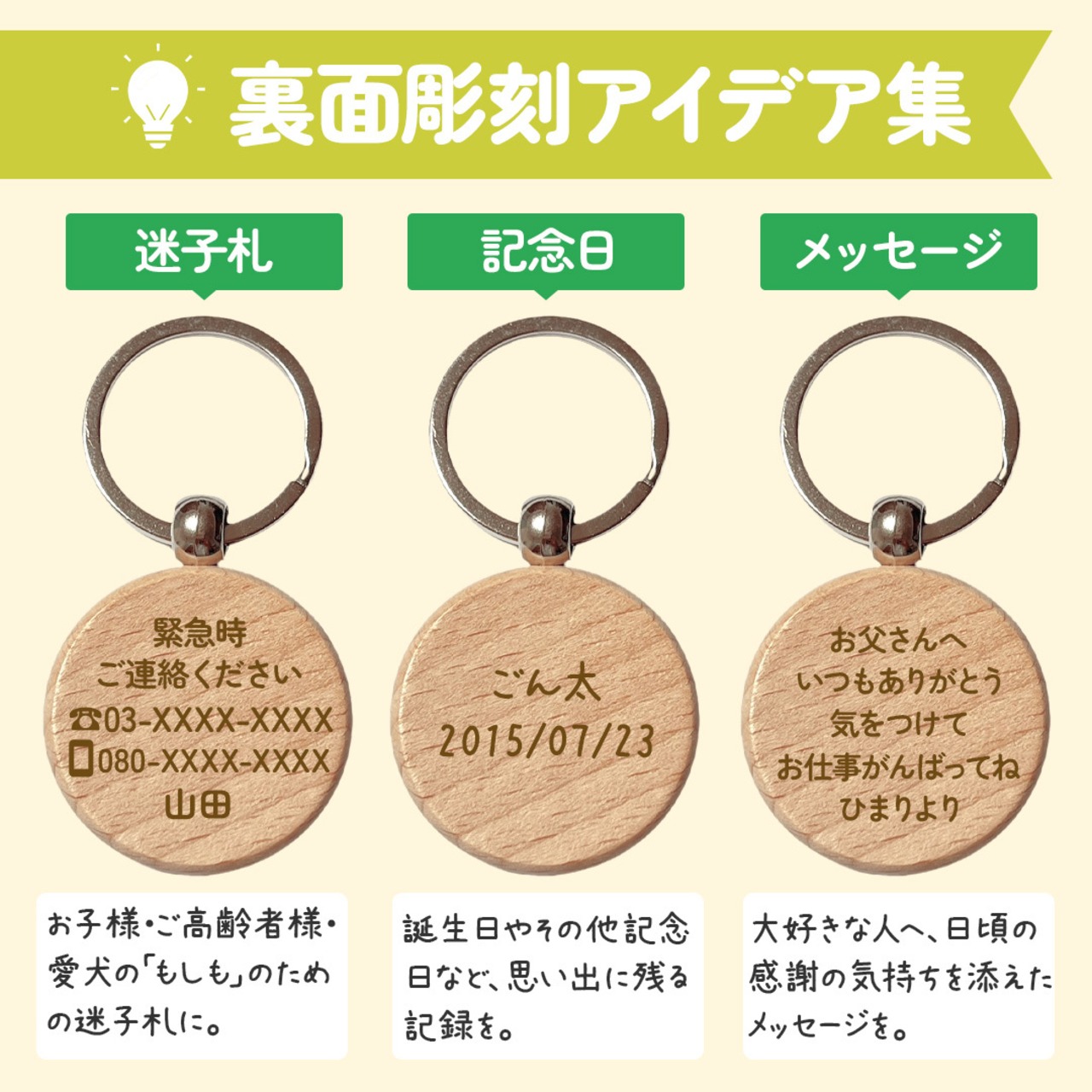 一言メッセージを添えたり、緊急連絡先を添えて迷子札にしたり、記念品として誕生日や記念日を入れたりとアイデア次第で様々な活用ができます。