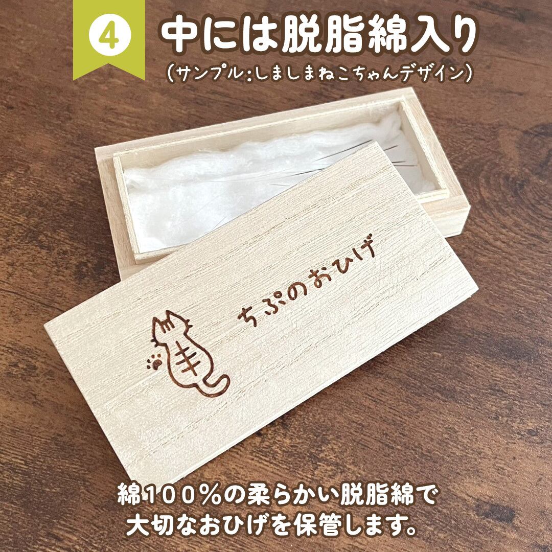 綿100%の脱脂綿をお入れしてお届けします。柔らかな素材なので、大切なねこちゃんのおひげを優しく保護してくれます。