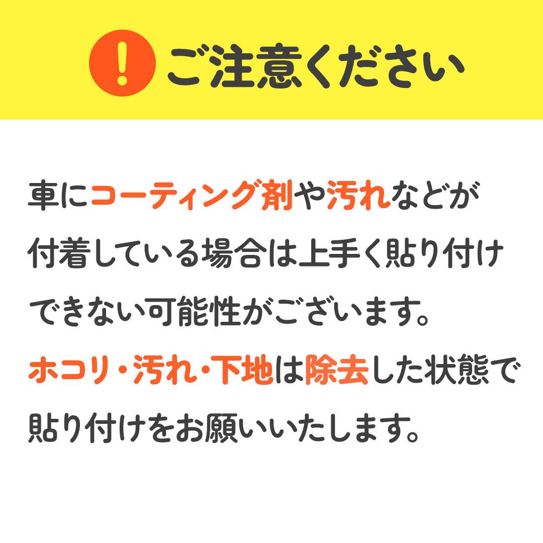 ●車にコーティング剤や汚れなどが付着している場合は上手く貼り付けが出来ない可能性がございます。ホコリ・汚れ・下地などは除去した状態で貼り付けをお願いいたします。